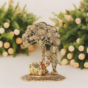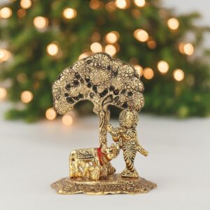 Exceptional Craftsmanship: This decorative showpiece is meticulously handcrafted by skilled artisans, ensuring each detail is rendered with precision and care. From the intricate patterns on Krishna’s attire to the delicate leaves of the tree and the serene posture of Kamdhenu, every element is crafted to perfection. The high-quality metal construction ensures durability and a lasting sheen, making it a timeless addition to your decor. Symbolism and Spiritual Significance Lord Krishna, known for his divine playfulness and love, is depicted here in his iconic stance, playing the flute.