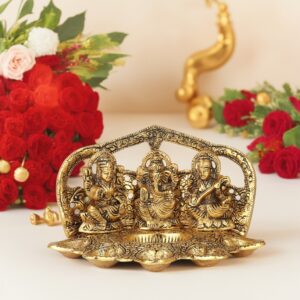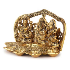 - Features intricately crafted idols of Laxmi, Ganesh, and Saraswati Ji set on a beautifully designed frame with 5 diyas, adding a touch of divine elegance to your pooja rituals and home decor.