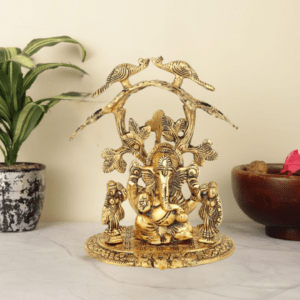 The attention to detail is evident in the intricate design of Lord Ganesha, seated gracefully under the protective Chhatra, with Riddhi and Siddhi by his side. The fine craftsmanship ensures that every feature, from Ganesha’s serene expression to the delicate embellishments, is captured with precision and care. Symbolism and Significance Lord Ganesha, revered as the remover of obstacles and the harbinger of good fortune, is an essential deity in Hindu culture. The presence of Riddhi (prosperity) and Siddhi (spiritual power) alongside him amplifies the positive energy and blessings. This statue is not only a symbol of divine grace but also a representation of balance and harmony, making it a meaningful gift for loved ones or a treasured keepsake for yourself.